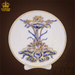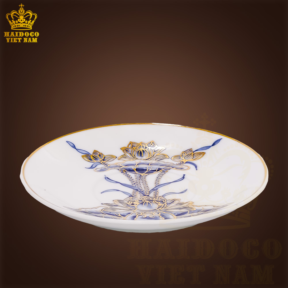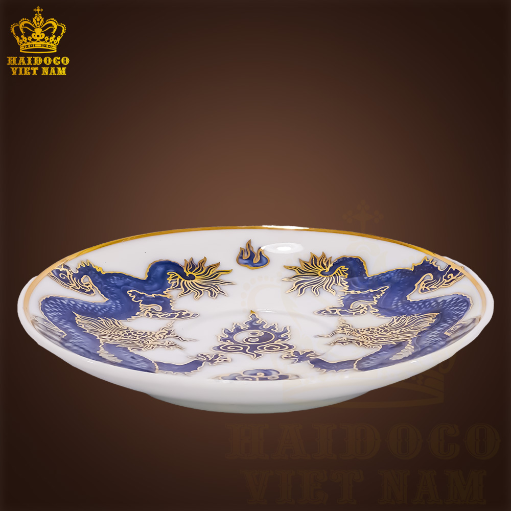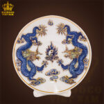 Đĩa Trầu Cau chàm vàng 24K là vật phẩm mang đậm nét truyền thống trong nghi thức thờ cúng của người Việt. Với tạo hình cân đối, tinh tế cùng họa tiết vẽ tay bằng vàng thật 24K trên nền men trắng ngọc, sản phẩm vừa dùng để dâng trầu cau lên bàn thờ tổ tiên, vừa thể hiện sự trang nghiêm và thành kính trong từng lễ nghi gia đình.