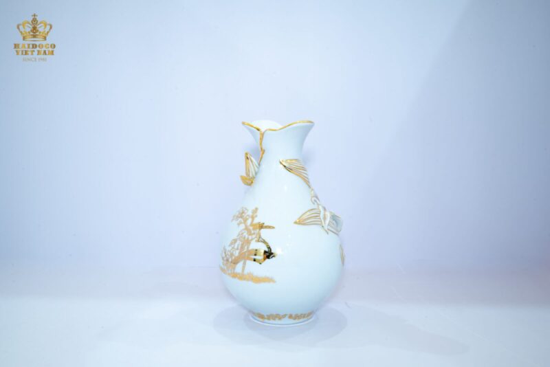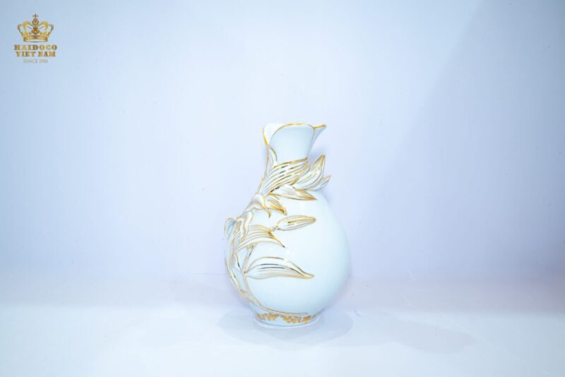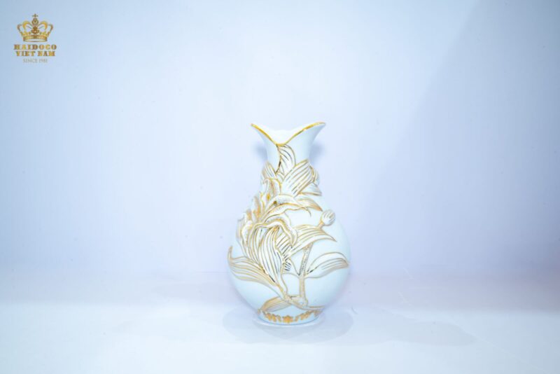 Bông Hoa Ly sứ vẽ vàng được làm nổi bật hẳn lên trên nền bạch ngọc trắng. Điểm nhấn độc đáo này tạo nên sự khác biệt với những lọ hoa truyền thống khác. Đây là sự cách tân độc đáo, vừa giữ được vẻ sang trọng, quý phái mà vẫn hiện đại. Hình ảnh bông hoa nổi lên giữa tán lá tạo nên đan xen đẹp mắt, hài hòa như một nhành hoa ngày xuân vừa nở đủ lúc xuân thì đẹp nhất.